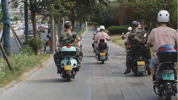 骑着电动车跟在队伍旁。