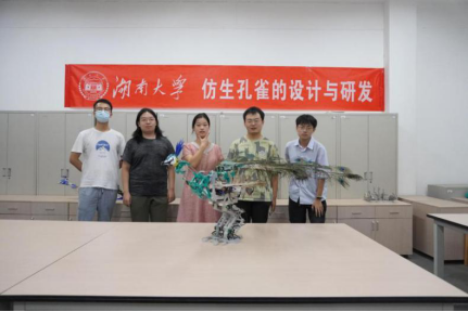 第十届机创大赛国赛一等奖项目名称为“仿生孔雀的设计与研发”,项目成员为:贾宇辰、戴婧、高靖远、雷锐、李奥南,指导老师为:伍素珍、王刚。该作品从校赛倒数第三的幸运出线到国赛的一等奖,设计团队在短短数月里,完成了从无到有的机械孔雀结构设计及作品迭代,并倾尽全力准备竞赛相关材料。在学校的支持、指导老师的悉心指导下,设计团队展示出无限创造力与活力,表现出坚韧不拔的毅力和永不言弃的韧性,彰显了湖南大学学子勇于拼搏的精神。