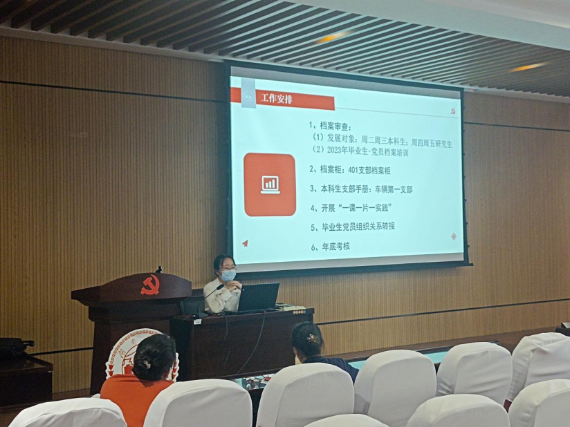总结完前期工作后,王玉迪老师为大家介绍了未来的工作安排。要求各支部近期完成对入党同学档案的审查,开展“一课一片一实践”(每月举行一次党课,组织一次红色观影,开展一次实践)等党建活动,并认真准备毕业生党员关系转接及年底考核。为确保审查工作的顺利进行,王玉迪老师对各支部委员展开培训,细致讲解各流程材料的准备、填写,并为同学们答疑。