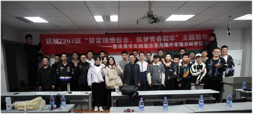 11月16日下午,机械2207班“坚定理想信念,筑梦青春韶华”主题班会顺利召开。班会以党的二十大为背景,推进学风建设为目的,围绕学业规划和理想树立展开,既是对新一届机械七班学期过半的总结研讨,也是对人生目标的一次思维碰撞与探索解惑,更增添班集体的凝聚力和战斗力,展现了青年学生朝气蓬勃的精神风貌。本次班会由班长张浩淼作总主持,各班委干部积极协调配合,共同策划,机械七班全体同学齐聚一堂,特邀班主任,三位保研学长与会,最终会议取得圆满成功。