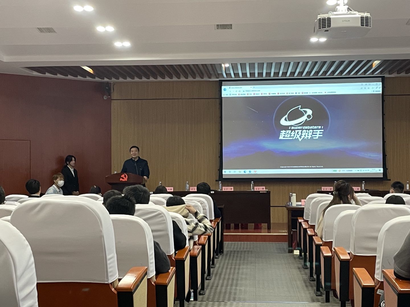 比赛正式开始前,贺迅老师致辞,总结回顾了本次辩论赛的发展历程与各路选手们的精彩表现,同时对赛场上各辩手的思辩风采寄予期望,鼓励更多同学积极参与辩论赛事。