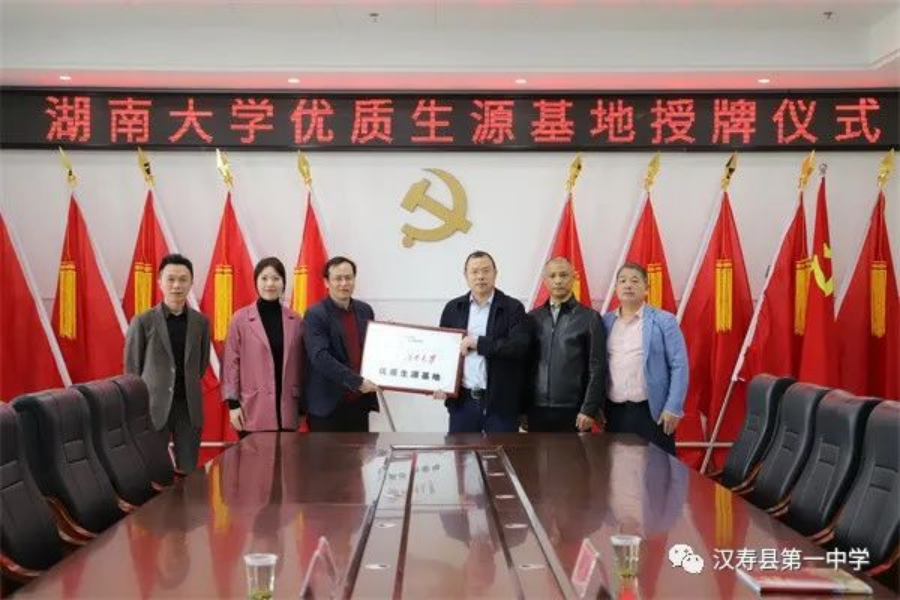3月12日上午,湖南大学优质生源基地授牌仪式在汉寿一中举行。44118太阳成城集团党委副书记、纪委书记周加喜,湖南大学招生宣传办公室主任曾芷兰,汉寿一中党委书记、校长胡浩出席。仪式由汉寿一中纪委书记黄锦钢主持。