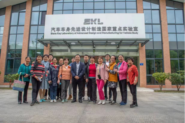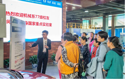 从岳麓书院离开后,师姐们来到东方红广场合影,随后前往湖南大学校碑下集体合影并按照当年班级分开合影,回忆当年学生时代生活。拍照完,大家来到国家重点车身重点实验室,由贺书记和李彬学长讲解,在讲解过程中师姐对于一些车身制造提出了一些关于自己的见解,师姐们对探月车样车产生了浓厚的兴趣,在增材减材方面师姐发出感叹与她们那时的技术有了极大的提升,最后师姐们在车身实验室门口合照,并对如今国家重点车身制造实验室取得的成果感到高兴。