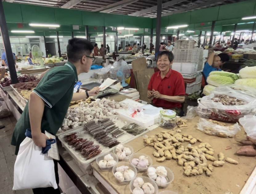 市场内灯光明亮,环境舒适,团队同学们向不同摊位的商户们和路过的居民分发“推普”宣传单并邀请其填写调查问卷。商户们都非常热情,积极配合同学们的调查,为团队提供了宝贵的反馈。他们大多说方言,能听懂普通话,但与外地人交流略有障碍;对推普活动十分热情,对学好普通话有信心。