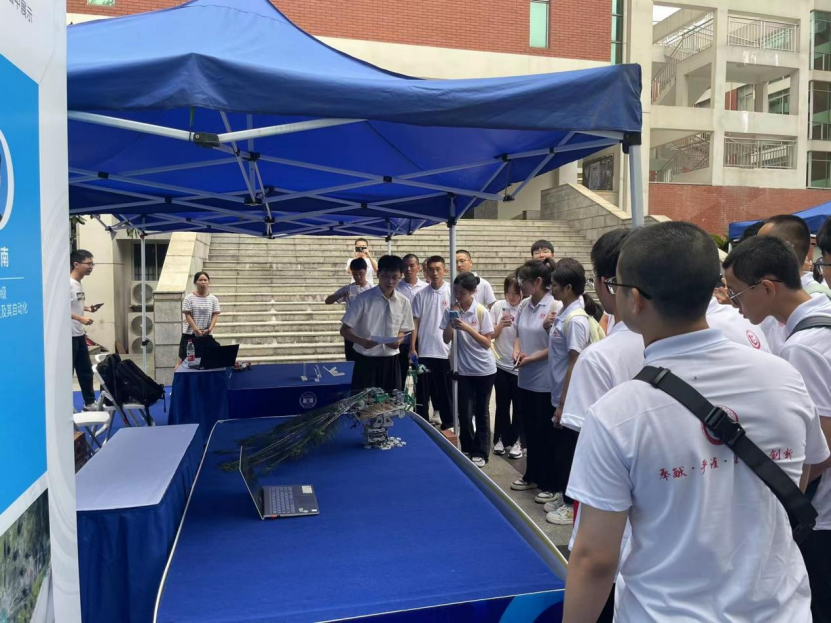 “仿生孔雀的设计与研发”吸引了许多新生和家长,这是我校2019级本科生贾宇辰等同学在伍素珍老师和王刚教授的指导下研发的一款具有蹲起、行走、开屏、展翅、抬头、声控等功能的仿生孔雀,通过对机械结构进行设计与控制来实现对孔雀的动作姿态和真实生活习性的展示。