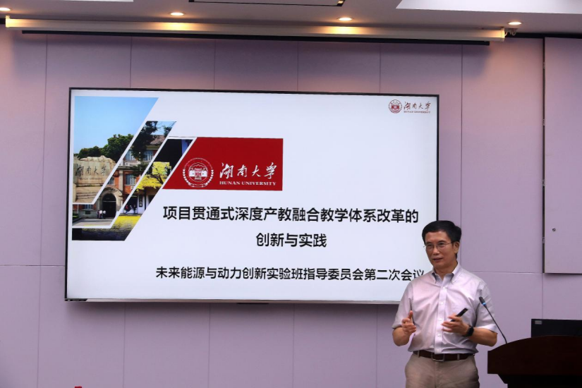 康明斯原副总裁、湖南大学特聘教授、能源与动力系彭立新汇报了实验班教学体系改革创新和实践进展,从培养体系构建、教育理念重塑、贯通式项目、实验室建设宗旨等几个方面介绍了实验班实施理念。