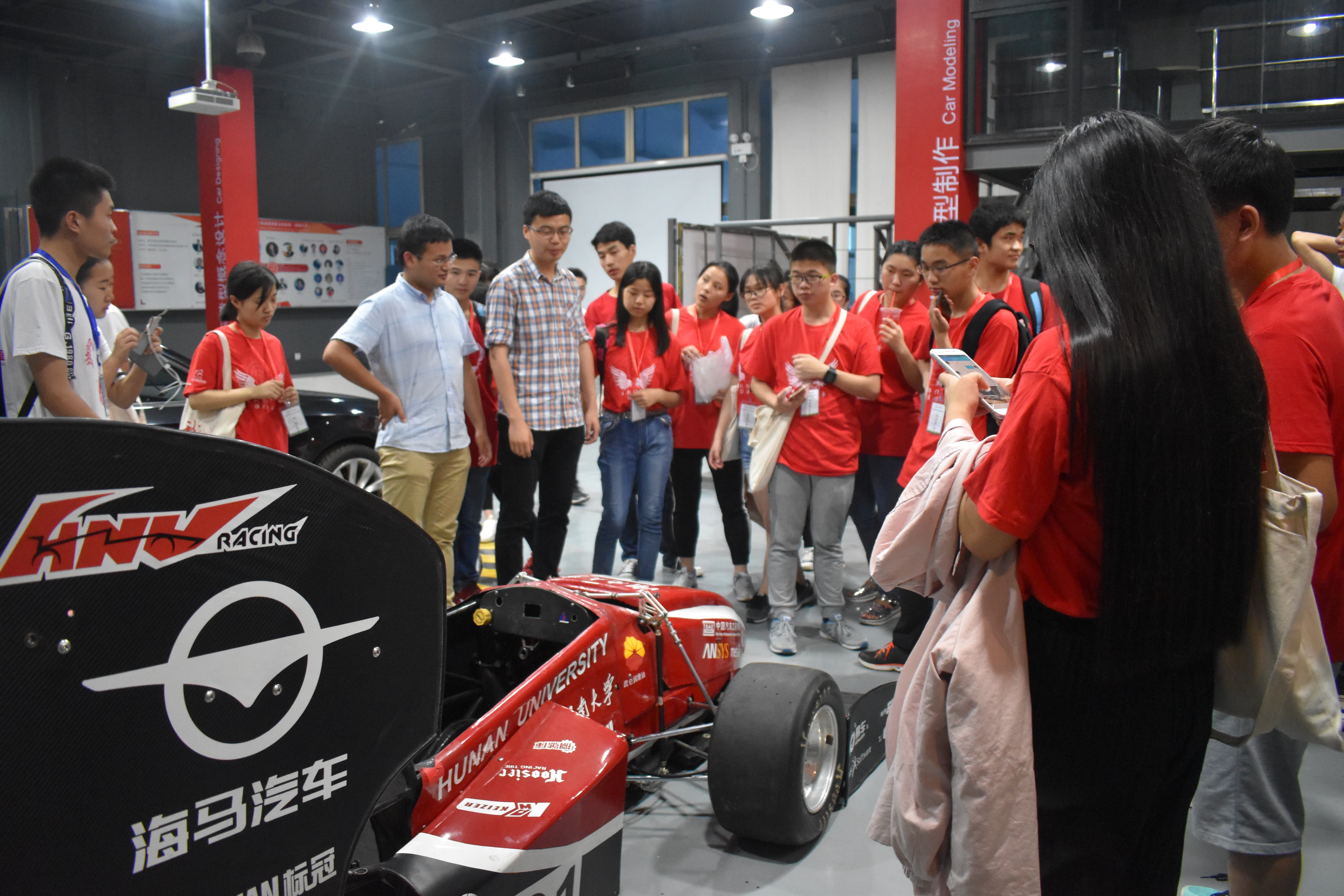 在讲解员的带领下,同学们依次参观了实验室成果展厅、汽车碰撞实验室、五轴轻型高速数控加工中心等。同学们对这些第一次见到的设备展现出极大的兴趣。特别是在“菱形轿车”和FSAE赛车前,大家驻足了许久,并在这些结构新奇的汽车前提出了自己的见解。