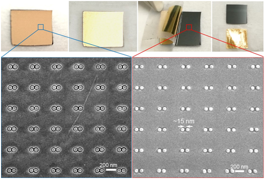 下二图为金属纳米圆盘的轮廓线图形和选择性剥离后留下的金属纳米光学天线阵列。