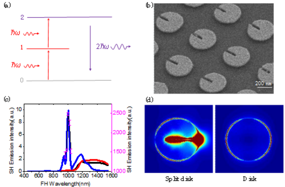 (a)二次谐波示意图(b)Splitdisk样品图片(c)splitdisk在不同偏振方向下激发的二次谐波的强度(蓝色线,偏振方向垂直于间隙;红色线,偏振方向平行于间隙)与激发波长的关系以及与完整圆盘(黑色线)的对比,(d)二次谐波产生波段近场增强示意图。