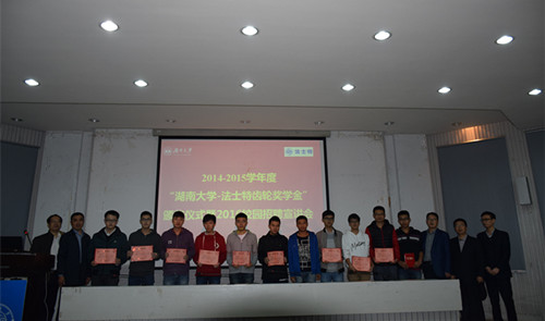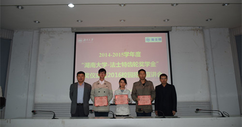 法士特集团是我国最大的重型汽车变速器制造商,各项经营指标连续十二年保持中国齿轮行业第一,重型变速器产销量连续九年稳居世界第一。“法士特”是我国汽车工业的一张名片,并已成为蜚声国内外的民族品牌。不仅如此,法士特集团还是一个具有高度社会责任感的企业。为激励大学生努力学习、奋发图强,从2005年起,法士特开始在清华大学、吉林大学、西安交通大学等5所高校设立“法士特齿轮奖学金”,目前已拓展到包括我校在内的10所高校,支出奖学金总额达1480余万元。湖南大学作为“法士特齿轮奖学金”第4期新增高校,企业将连续三年为我校44118太阳成城集团本科生提供总计60万元的奖学金。