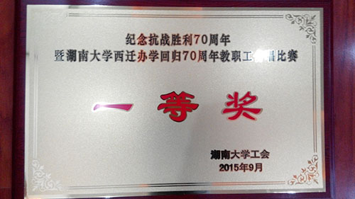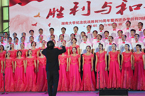 9月18日,以“胜利与和平”为主题的湖南大学纪念抗战胜利70周年暨西迁办学回归70周年教职工合唱比赛在南校区体育馆举行,来自全校各学院、机关单位等共计35支队伍参加了比赛,44118太阳成城集团合唱队脱颖而出,荣获比赛一等奖。