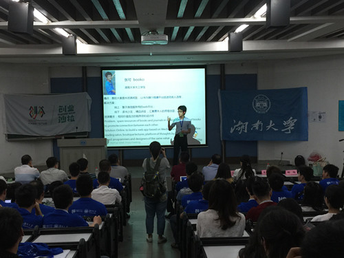 湖南大学孙标标同学第一个走上舞台,为与会者介绍一款勇于现场课堂辅助教学APP——“立体移动投射课堂”。湖南大学大三学生张可以高校图书资源闲置为切入点,以书为媒介搭建平台进行创业。
