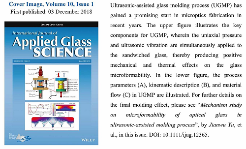 国家高效磨削工程技术研究中心余剑武教授在2018年12月3日出版的《应用玻璃科学》(Applied Glass Science)上发表最新研究成果“Mechanism Study on Micro-formability of Optical Glass in Ultrasonic-assisted Molding Process”,并选为该期刊的封面。《应用玻璃科学》是在玻璃领域最具权威性的综合性学术期刊之一,主要发表玻璃材料学前沿领域重要的原创性研究成果。该成果以湖南大学为第一单位,余剑武授为第一作者,罗红博士为通讯作者。