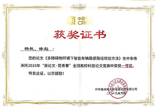 2019年9月27日,“赛论文 竞青春”全国高校科技论文竞赛在长沙举行颁奖仪式。湖南大学智能车辆团队研究生杨帆的论文《多障碍物环境下智能车辆局部路径规划方法》荣获一等奖。该论文结合曲线拟合与图搜索算法,为结构化道路中、多障碍物场景下智能车辆路径规划提出了新方法,具有较高的工程应用价值。
